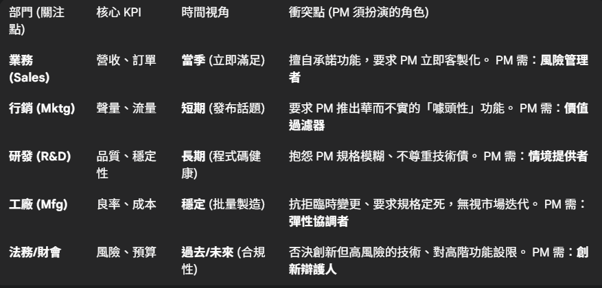 六大部門的衝突,根源在於KPI 差異和時間視角的巨大落差。PM 必須先理解他們的語言: