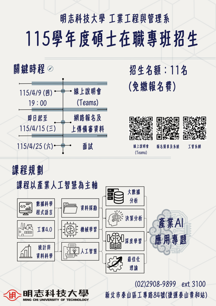 AI 時代來臨,無論是專案管理還是產品開發,掌握數據與 AI 應用已經是未來不可或缺的職場技能。如果你正在思考如何突破職涯瓶頸、將 AI 導入實務工作,明志科技大學工業工程與管理系的「115學年度碩士在職專班」正在熱烈招生中!